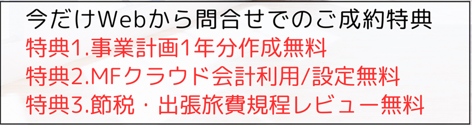 | <特典1(月先着1社)> 事業計画(簡易1年損益)お試し作成 本来オプションの事業計画作成を追加料金 ゼロで気軽にお試し下さい! | <特典2(成約の皆様)> 出張手当節税を税理士にじっくり 相談 チャットだけや無資格者担当事務所と 違い、税理士にじっくりZoom相談を保証 | <特典3(成約の皆様)> 役員報酬決定を税理士にじっくり 相談 チャットだけや無資格者担当事務所と 違い、税理士にじっくりZoom相談を保証 |
